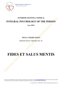 GABRIELA OSORIO VILLASEÑOR PSY. D. WWW.PSICOTERAPIACATOLICA.COM SUPERIOR TRAINING COURSE in INTEGRAL PSYCHOLOGY OF THE PERSON (year 2024) FINAL COURSE ESSAY Gabriela Osorio Villaseñor Psy. D. FIDES ET SALUS MENTIS This text has been published on April 20, 2024 by the undersigned on her personal web site www.psicoterapiacatolica.com . The text is protected by copyright law and may not be copied or reproduced (even partially, in other formats or media), nor may its authorship be appropriated. To contact the author: +393889270703 , gabrielaosorio@psicoterapiacatolica.com