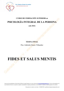 PSIC. GABRIELA OSORIO VILLASEÑOR WWW.PSICOTERAPIACATOLICA.COM CURSO DE FORMACIÓN SUPERIOR en PSICOLOGÍA INTEGRAL DE LA PERSONA (año 2024) TESINA FINAL Psic. Gabriela Osorio Villaseñor FIDES ET SALUS MENTIS Este texto ha sido publicado el 20 de abril de 2024 por la abajo firmante en su sitio web personal www.psicoterapiacatolica.com . El texto está protegido por la ley de derechos de autor y no puede ser copiado ni reproducido (ni siquiera parcialmente, en otros formatos o soportes), ni puede apropiarse de su autoría. Para ponerse en contacto con el autor: +393889270703 , gabrielaosorio@psicoterapiacatolica.com